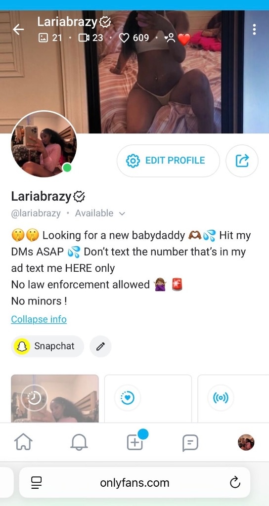 I'm currently looking for a new babydaddy 🤫🤫🤫🤫🤫 My last 2 baby daddies are literally no where to be found but its fine 💕 I been having this secret fetish for a long time ,Dont miss me this time , this is my 3rd time finding a random person to be my baby daddy ! Everybody be wondering who my last 2 are but Shit idk who they are my damn self 💦 I have a serious fetish of getting nutted inside of by random men and raising their babies no strings attatched 😩😩🥺🥺🥺🥺 ( P.s HIT ME UP ON ONLYFANS ONLY 💞 I DON'T RESPOND TO PEOPLE TEXTING MY PHONE NUMBER 🚨 THE POLICE ARE ACTIVE ON IMESSAGE ETC , IF U DON'T HAVE ONLYFANS THEN MAKE ONE DADDY AND HMU 😍 NO LAW ENFORCEMENT ! 🚨 HMU DISCREETLY ON ONLYFANS 🤤🤤 (Texting about A meet up on my meesages is a FEDERAL crime, and I dont commit crimes I just wanna fuck the people on my onlyfans LEGALLY with somebody with the same fetish as me 🤫🤤 ) At the time of me writing this its FREE , but that may change soon ! Add me daddy 😍🤤 I be horny as fuck like all of the time and I'm ready to have another baby , my last 2 babies are 4 years old and a 1 year old its been long enough I need to get nutted inside of again 😩😩 I dont care if your dick is small or large I just want cum inside of me simple ! I'm a freaky ass bitch and prolly the sexiest freak u gonna find i'm all yours Dada 🤫😫😫 AFTER I get pregnant we can keep fucking for free if u want I'll always wanna fuck my babydaddy's 🫣😍 I love when that warm cum is inside of my wet pussy it feels so good like omg 🥺🥺🥺 If u interested hit me up daddy 😍😘 I'm SUPER fertile and im looking for a freak thats just like me 😘💕 I been escorting for 6 years and So far I have 2 baby daddies I only met them once , I'm so fertile rn I been wet n horny asf like every day lately 😩💦 My pussy tight as fuck and My head 10/10 but don't nut inside of my mouth do it in my pussy no condoms no birth control 😍😍😍🤤 If u wanna talk to me DO NOT text my phone number I won't respond 💕 daddy 💕 Text me on Onlyfans ONLY if u interested in getting me pregnant 🤫🤫🤤 My onlyfans name is @ Lariabrazy Text me on onlyfans ONLY daddy, I respond FAST ASF on there ! I don't respond to people texting my phone number, I use that for my personal life ❤️❤️🫶 Serious freaks ONLY NO MINORS ! Cum in me 💦 Get me pregnant 🤰🏽 And leave ✌🏾or stay 🫶🏽🫶🏽❤🩷🩵 ( preferably I want you to stay 🥰) @Lariabrazy hit me up on OF Dada 🤤🤤 If you dont have one make one ASAP 🤤🤫🤫 Also, I'm disease free currently 💦💦💦 and i'm Fertile asf right now 🤫🤫🤫💦 I'm petite and taste like Candy 🍭🍭🍭